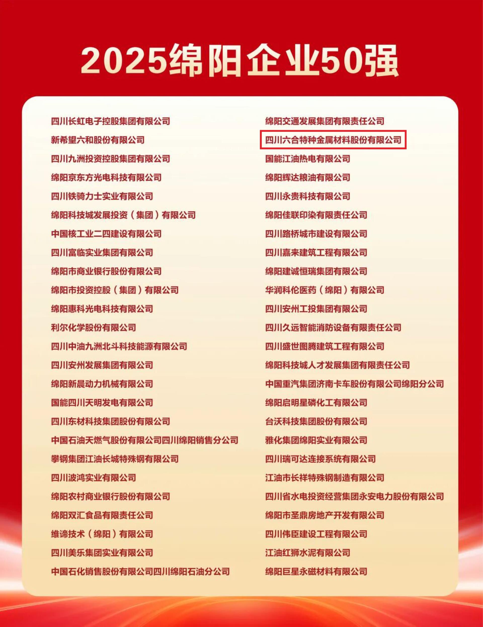 10 月 24 日,2025 绵阳企业 50 强发布会在四川绵阳工业园举行,betway88西汉姆联(简称 “betway88西汉姆联”)凭借特种金属材料领域的技术突破、稳健经营与产业贡献,成功入选,成为先进材料产业标杆。